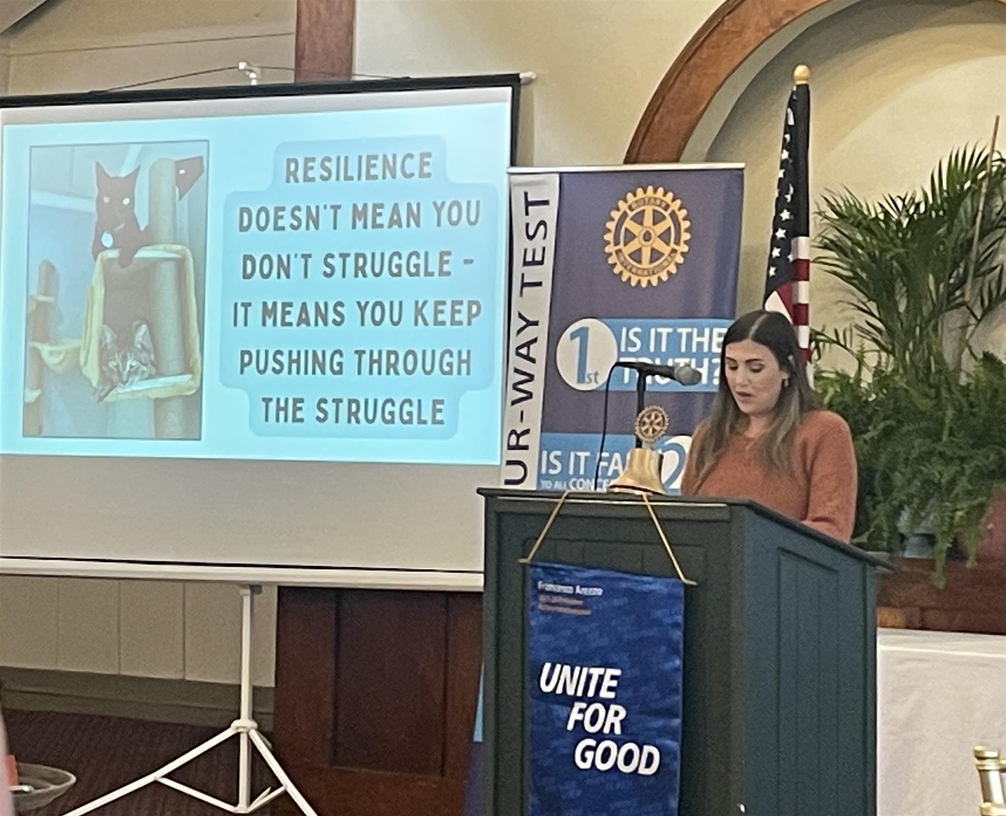 Past President Stacy Rodriguez for the 4 way test coin presentation and our Sergeant at Arms, Trish Wingerter.